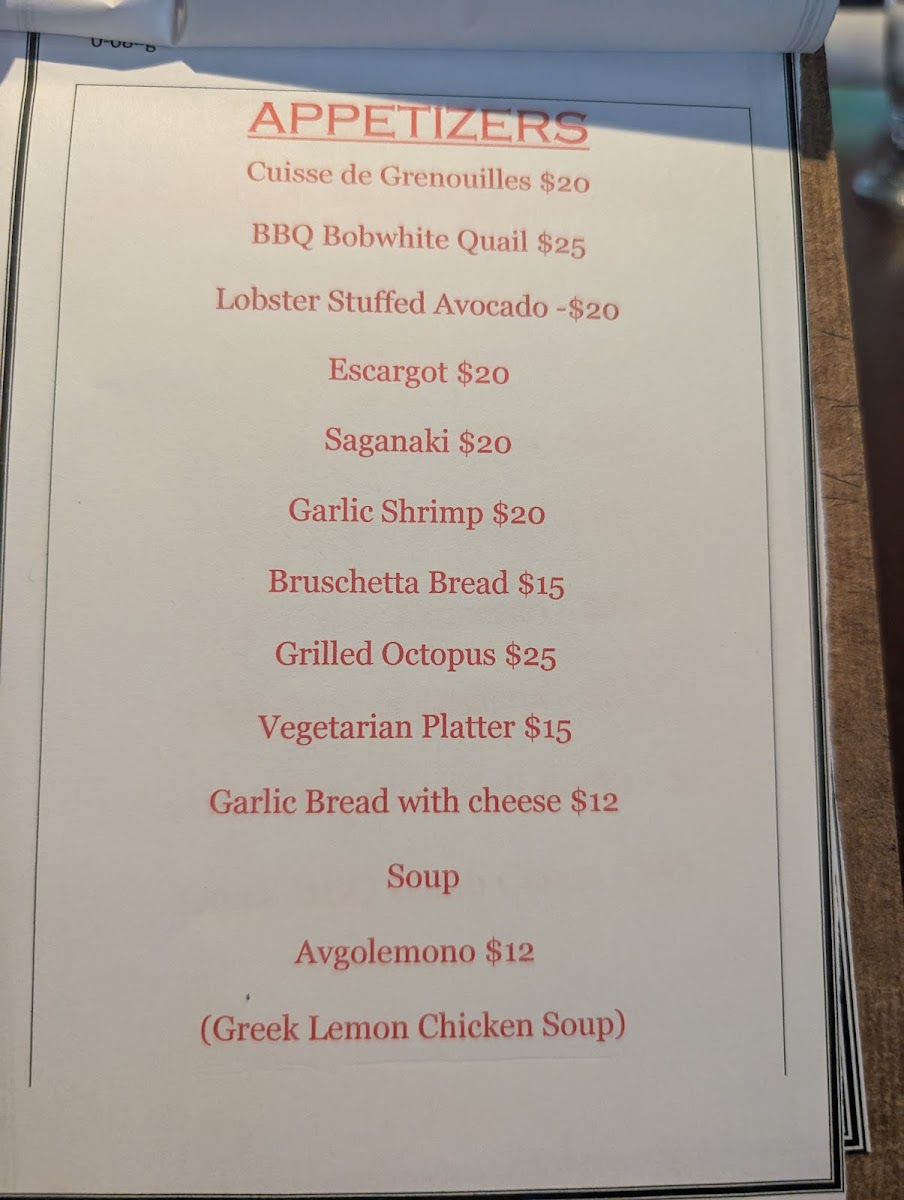 At Gus & Guido's Backyard, located at 32 Stanley St, Ayr, ON N0B 1E0, Canada, the menu offers a diverse selection of dishes that cater to a variety of tastes, from appetizers to hearty entrees and refreshing beverages. Starting with Appetizers, you can enjoy a range of flavors such as the delicate Cuisse De Grenouilles, BBQ Bobwhite Quail, or the savory Lobster Stuffed Avocado Escargot. For something more traditional, the Saganaki provides a delightful taste of Greek cuisine.