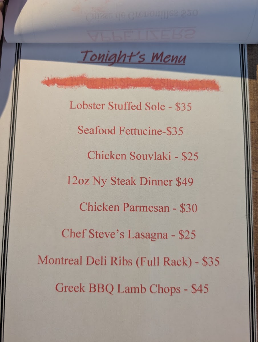 For a special treat, check out Tonight's Menu, which features standout dishes like the Lobster Stuffed Sole, the creamy Seafood Fettucine, and the always satisfying Chicken Souvlaki. If you're craving something hearty, the 12oz NY Steak Dinner or the classic Chicken Parmesan are sure to hit the spot.